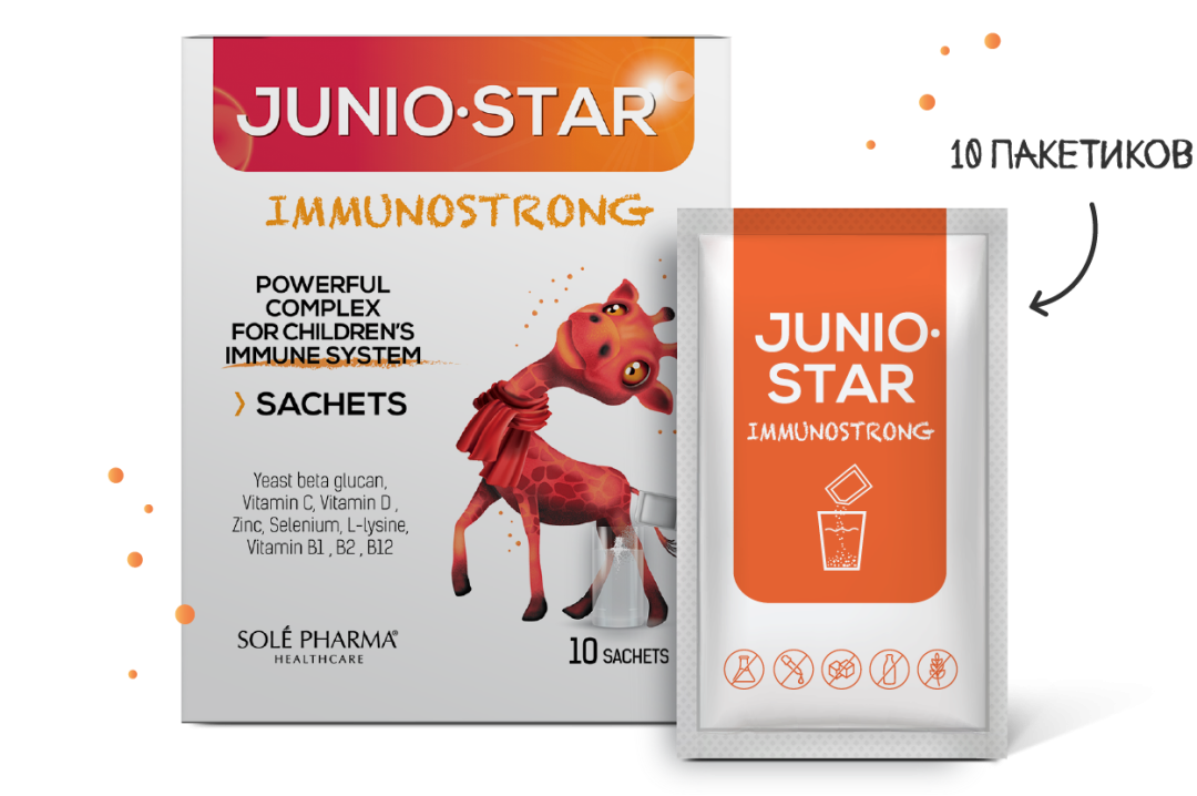 Мощный комплекс для иммунитета детей на основе сильного иммуномодулирующего ингредиента дрожжевого бета-глюкана в сочетании с важнейшими витаминами и минералами. Junio·Star® Immunostrong эффективно снижает частоту и продолжительность простудных заболеваний.